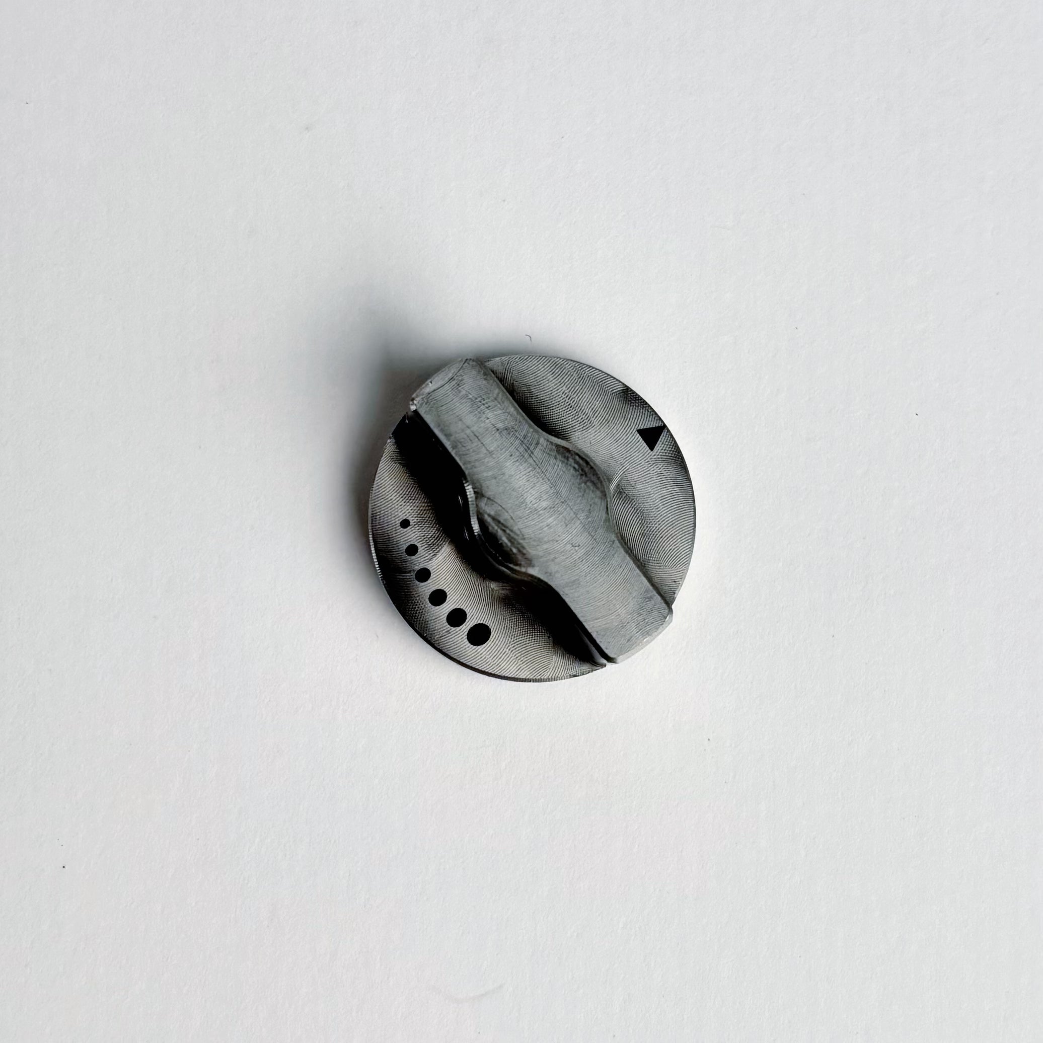The regulating valve knob sets and locks the grind size, with clear directional indicators for fine or coarse adjustment.