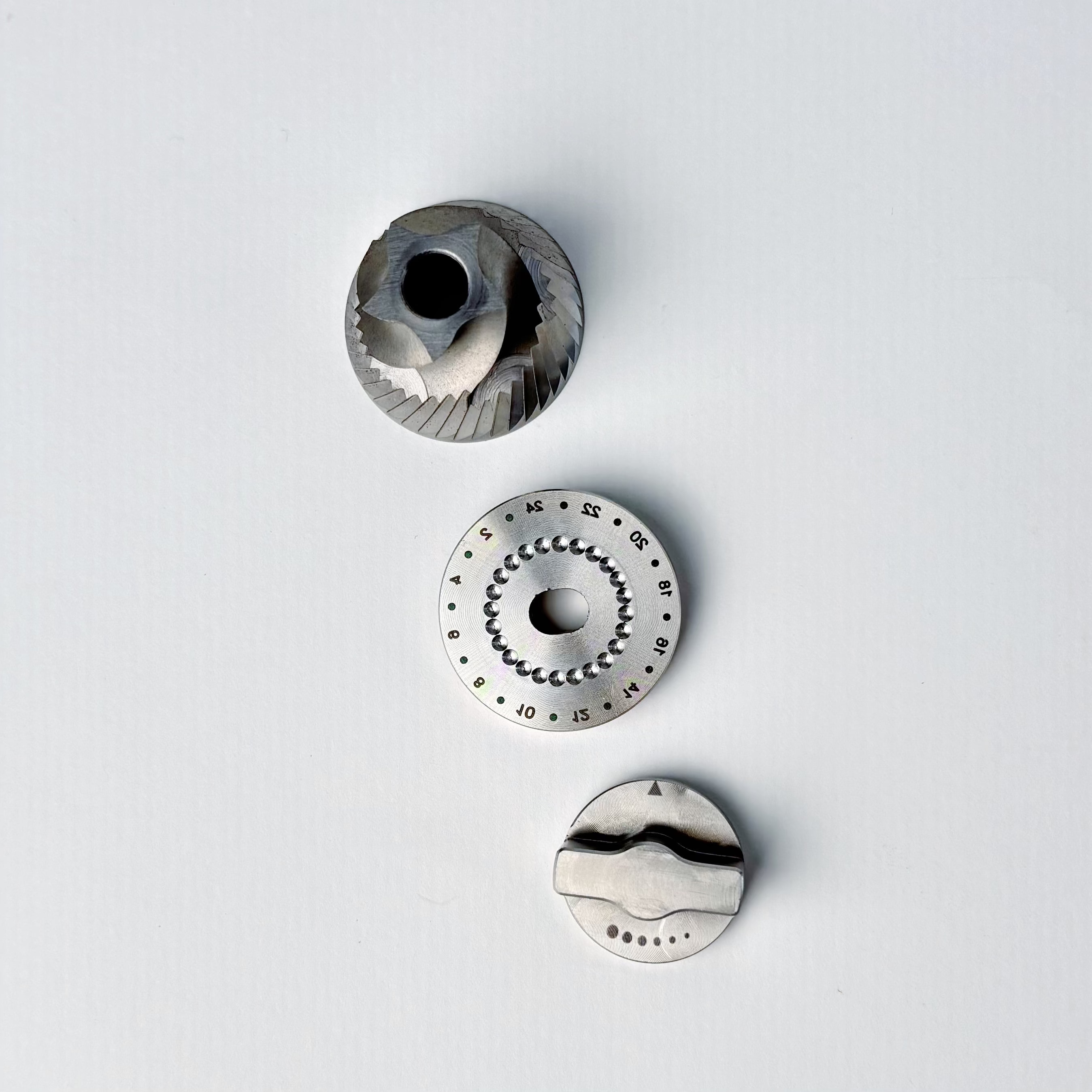Key stainless steel parts—burrs, dial, and adjuster—directly control grind size and consistency for perfect coffee.